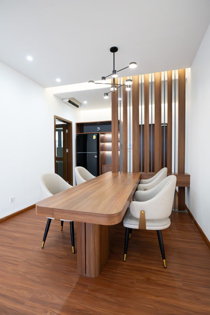 为了充分利用有限的空间,隔断与餐桌无缝融合,兼具实用的艺术品。桌子的圆形桌腿不仅增添了时尚感,而且还能防止与尖角发生碰撞。其尺寸和材质的选择模仿了实木的外观和感觉,增强了房间的自然美感。
