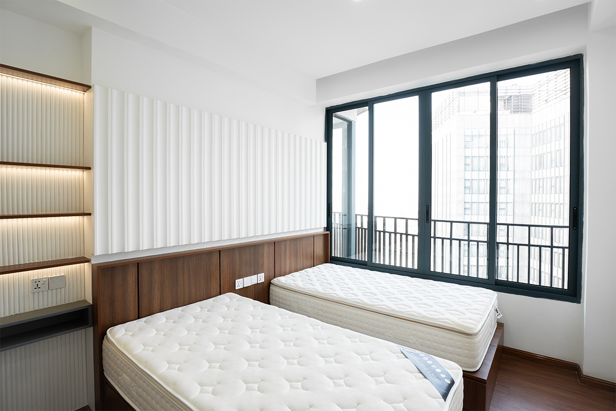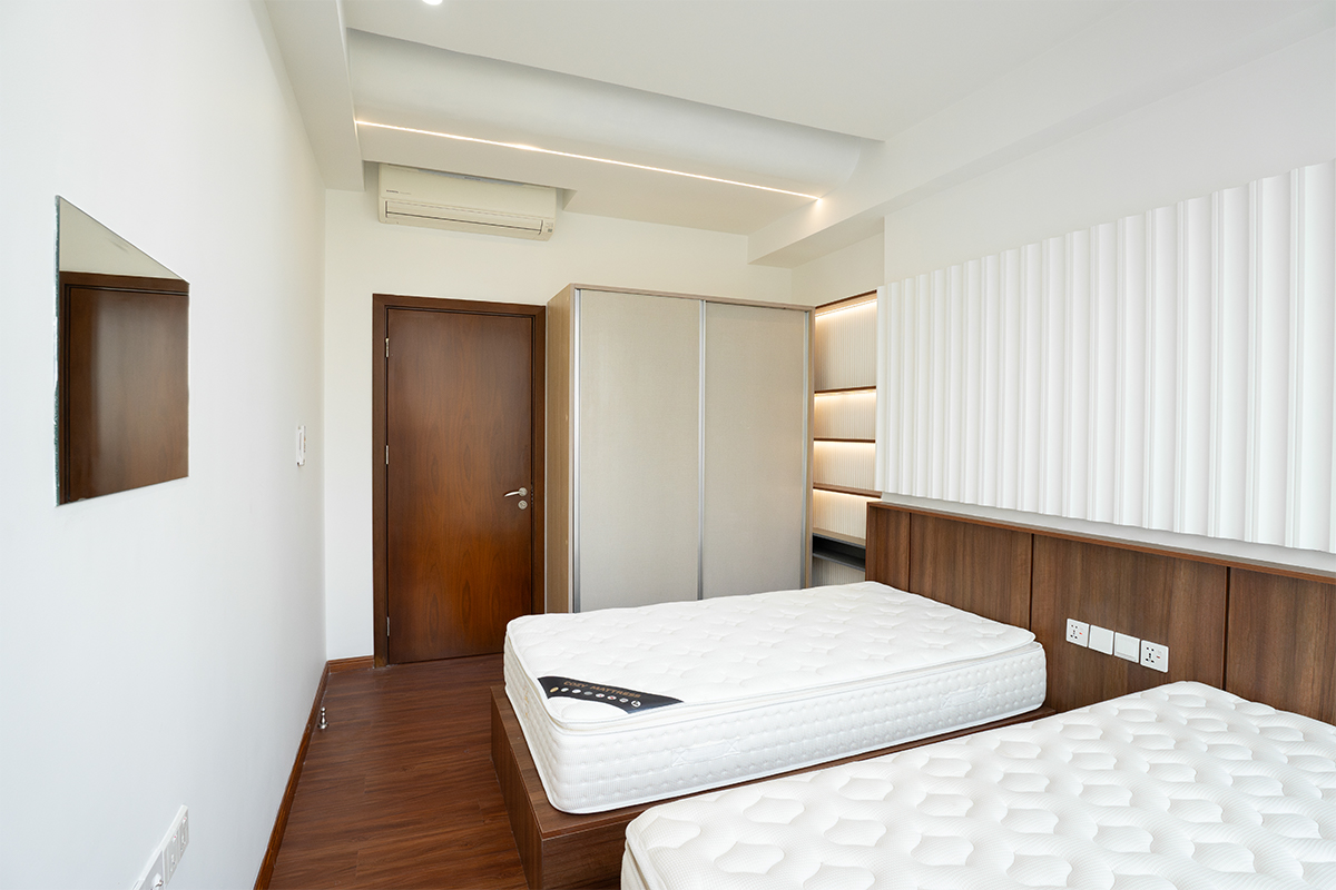 在公共卧室中,设计采用了与客厅类似的方法,将弯曲元素融入特色中,以保持视觉趣味和开放性。我们没有覆盖整面墙,而是让原有墙面的某些区域暴露在外,以创造深度并减少单调和局限感。保留了现有的衣柜,但改变了房间布局,以更好地适应新的配置。衣柜无缝融入设计中,确保功能性而不损害美观。为了增强天花板设计,我们引入了弯曲元素,增添了俏皮感并增加了房间的视觉吸引力,从而营造出更具活力和吸引力的空间。