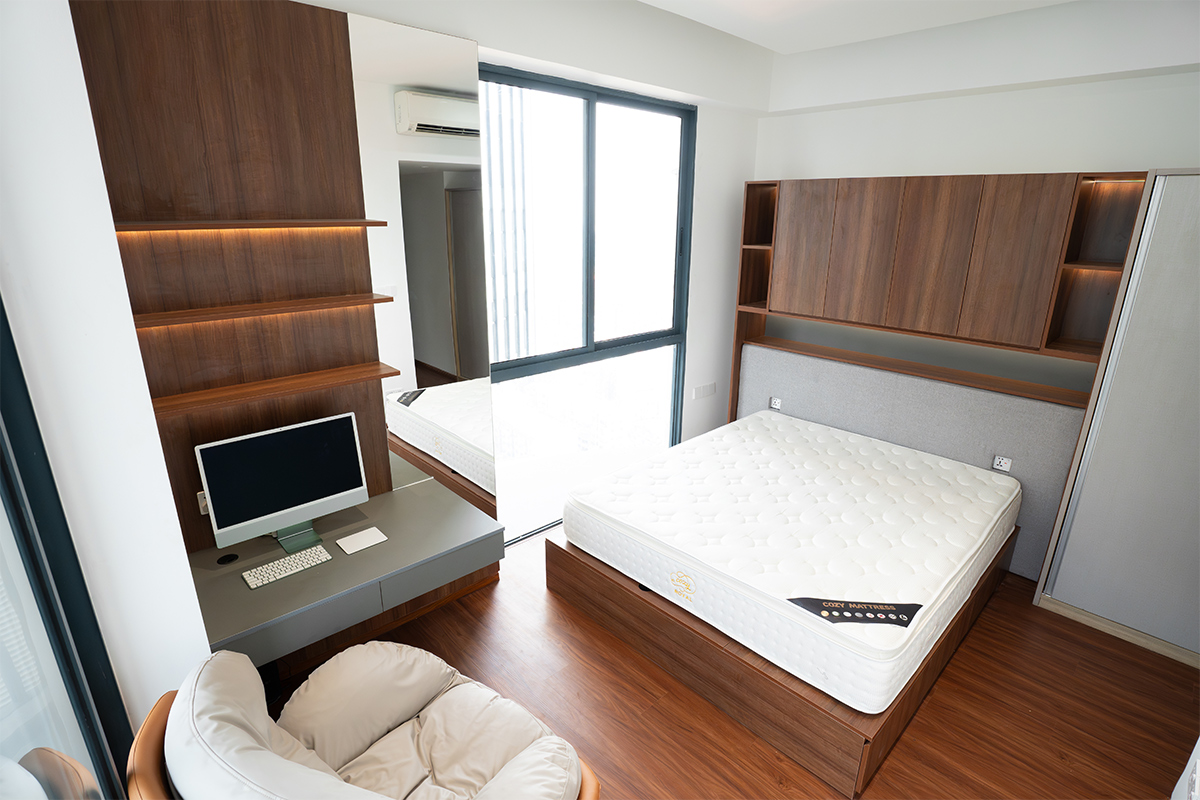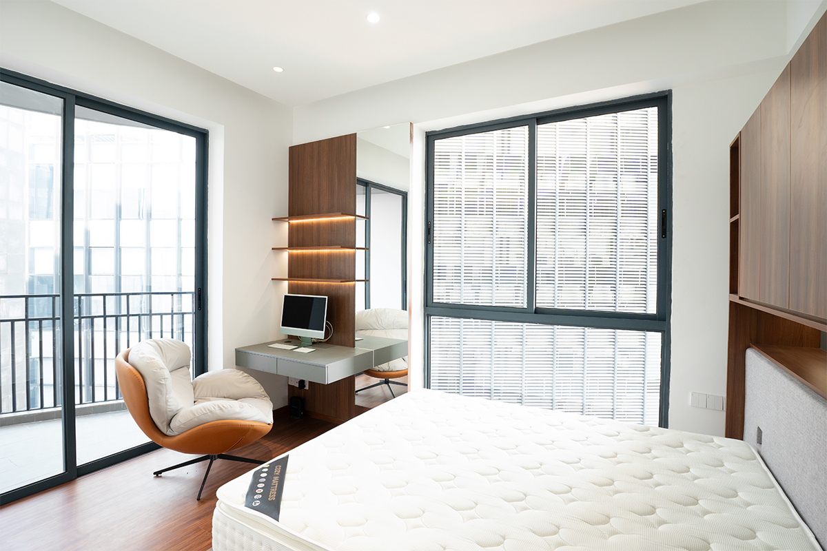 在主卧室,充足的自然光通过大窗户和阳台倾泻而下,营造出明亮的氛围。然而,在保持开放感的同时最大限度地利用存储空间是一个挑战,尤其是在有一张大床的情况下