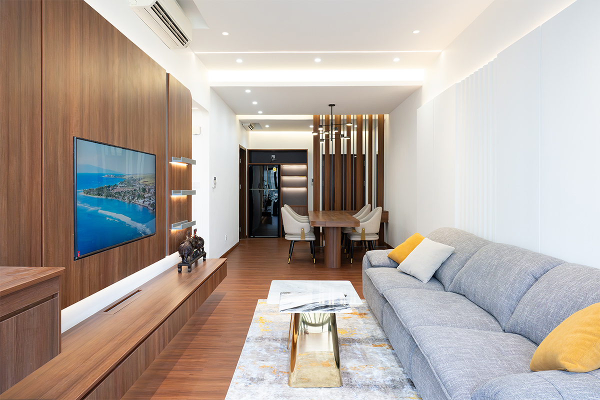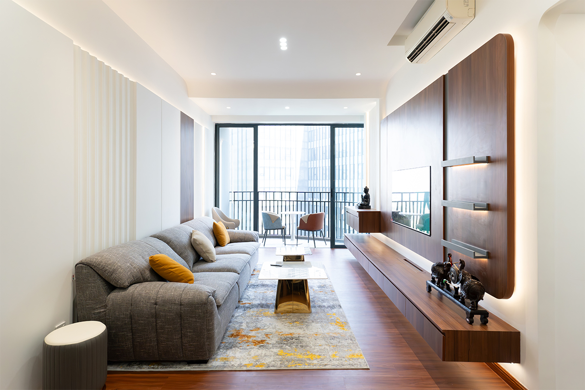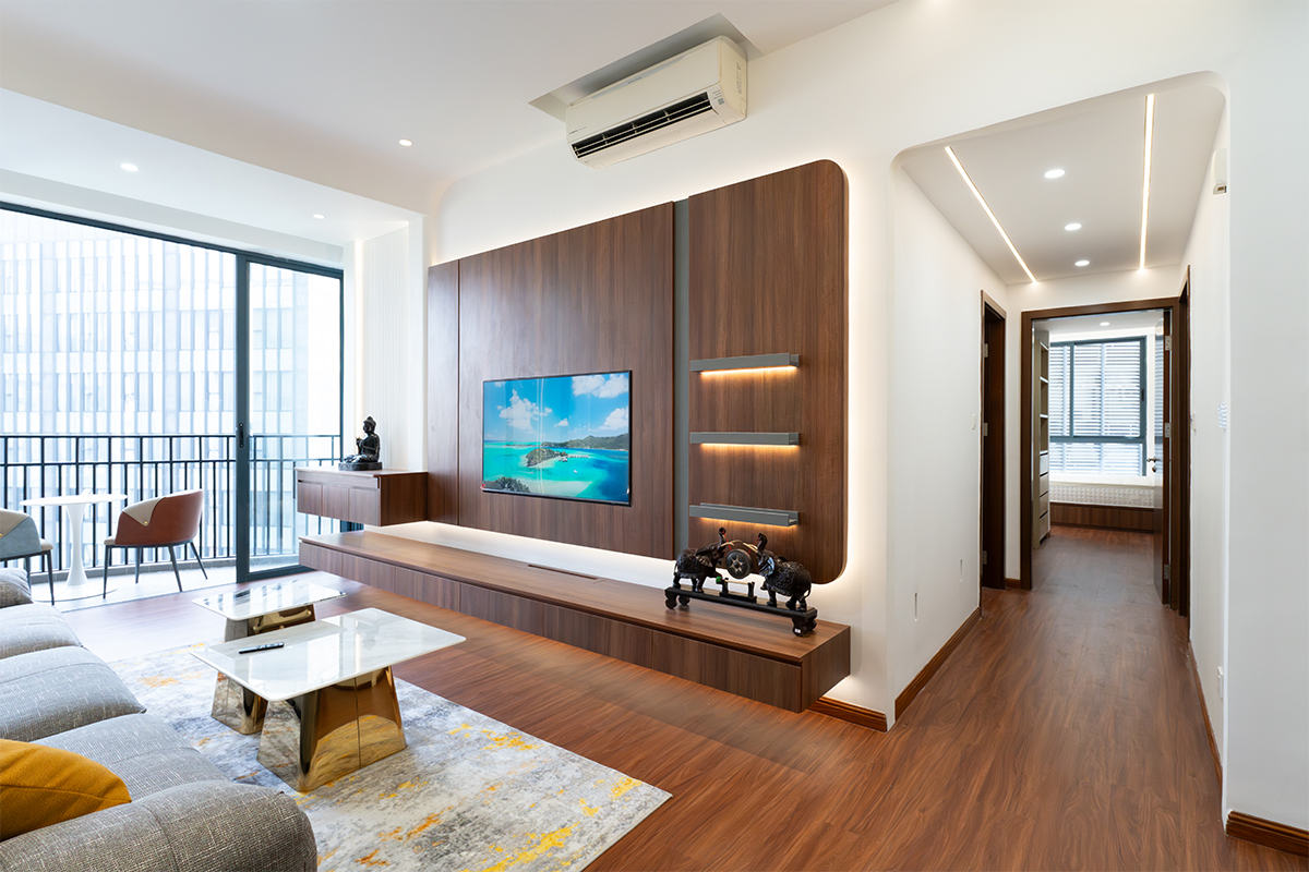 为了克服房间狭小的感觉,我们专注于改善客厅设计,营造宽敞温暖的氛围,同时保持现代而又诱人的美感,并带有一丝奢华感。主要的设计氛围围绕着融入木质元素以营造温暖感和现代简约风格,“为了实现这一点,我们选择了电视柜等关键区域的浮动设计,营造出开放通风的感觉,同时满足机器人吸尘器等实际需求。”
