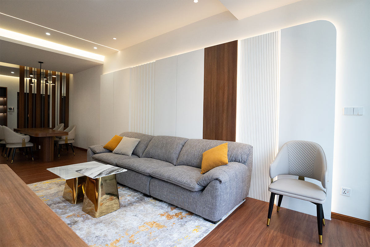 为了柔和过渡并营造出统一的外观,沙发和特色墙采用了弧形元素,增添了柔和的触感并与周围环境无缝融合。在天花板设计中,弧形元素被用来柔化梁的外观,减少笨重感并将焦点吸引到阳台的美景上,从而增强了整体氛围。